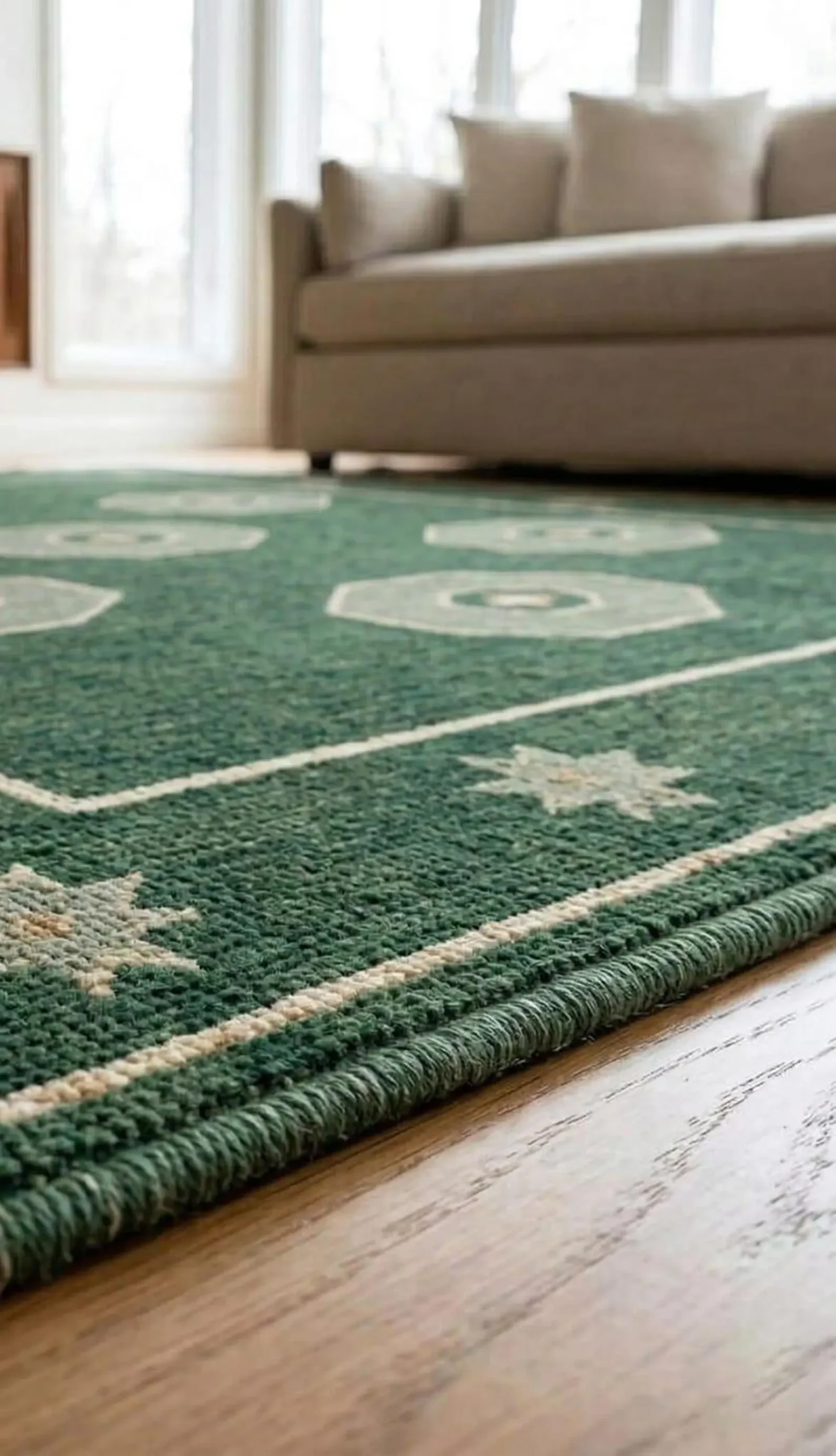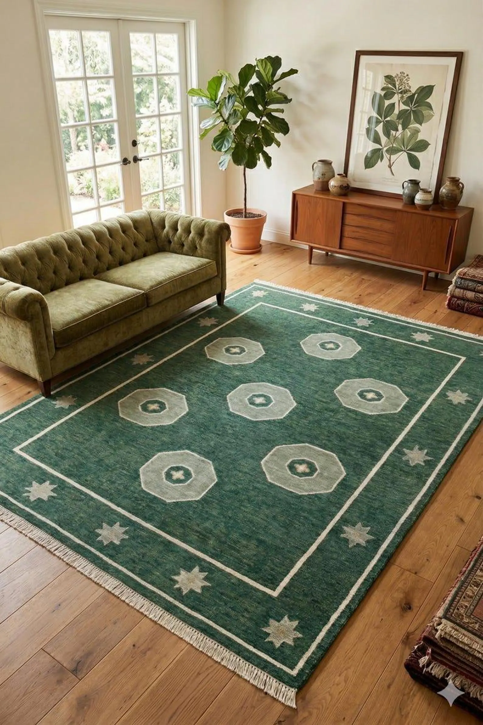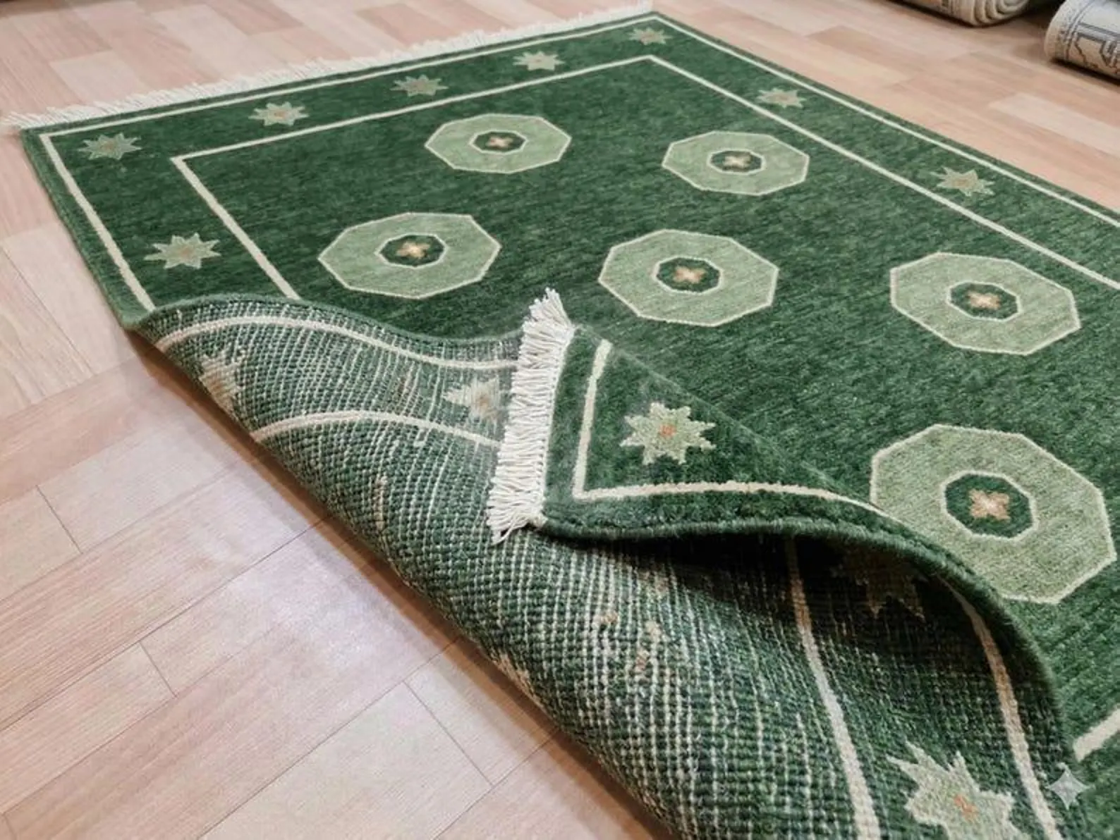 🏡 Premium green hand knotted rug with minimalist geometric pattern. Handmade wool carpet perfect for modern homes, living rooms, and bedrooms.