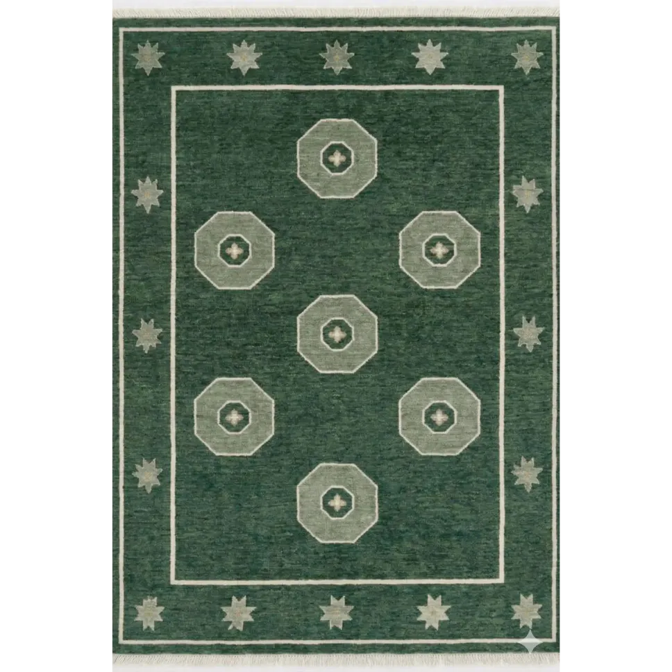 Bring elegance and simplicity into your home with this green hand knotted rug, crafted using traditional techniques by skilled artisans. Featuring a rich green base with subtle ivory geometric motifs, this rug offers a perfect balance of modern minimalism and timeless craftsmanship.