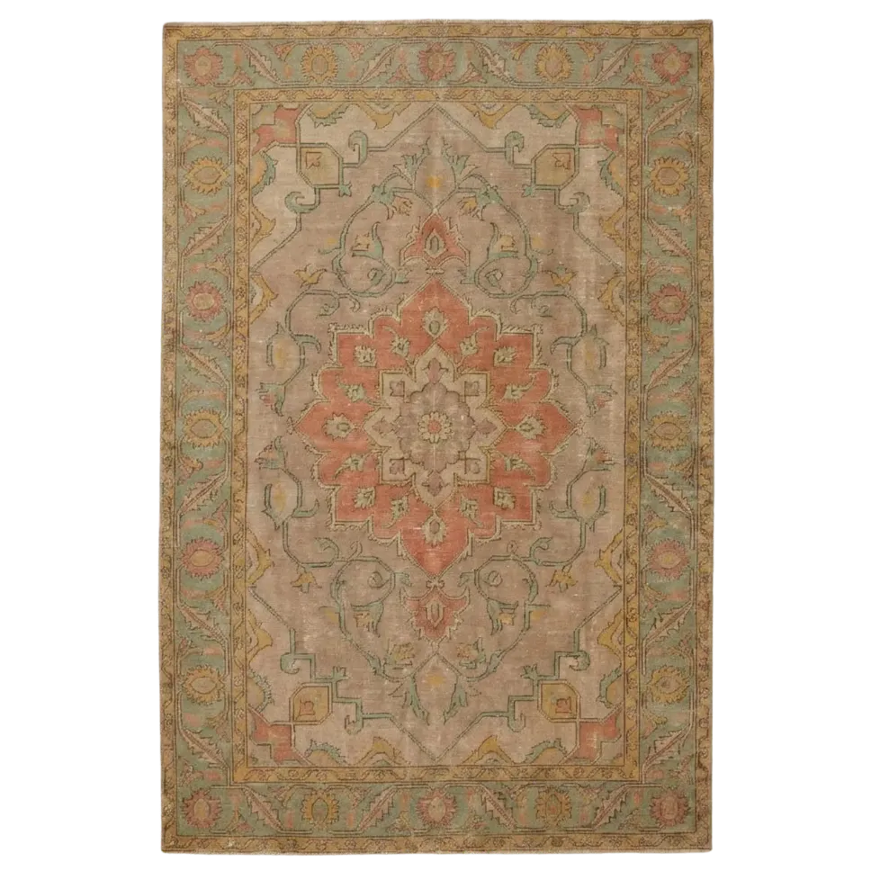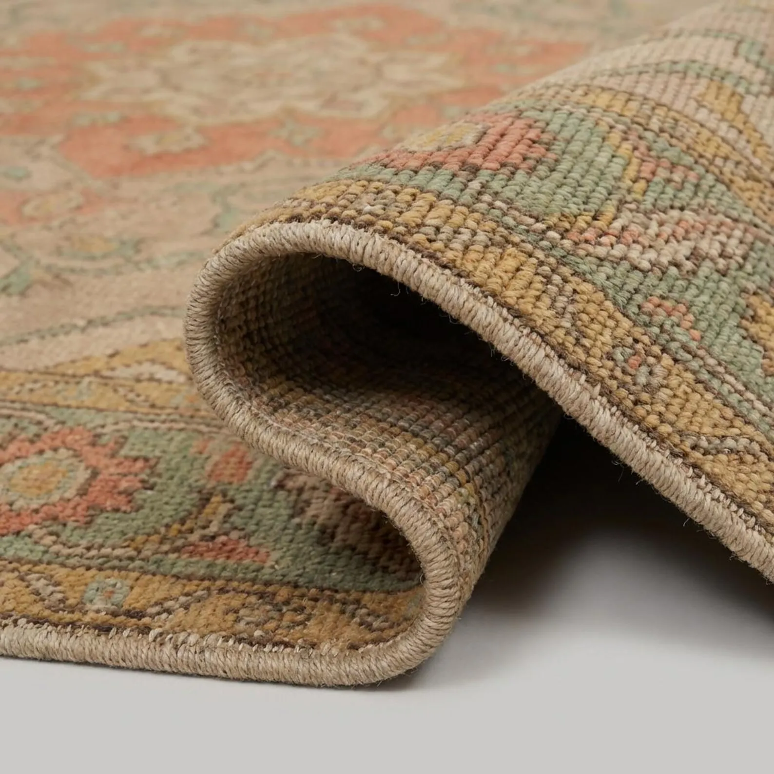 Vintage Persian hand knotted wool medallion rug Bhadohi brings classic elegance to your home with its large coral-red central medallion set against a soft beige field. Intricate floral vines, sage green borders, and golden accents create a timeless Persian design that feels both traditional and inviting.
