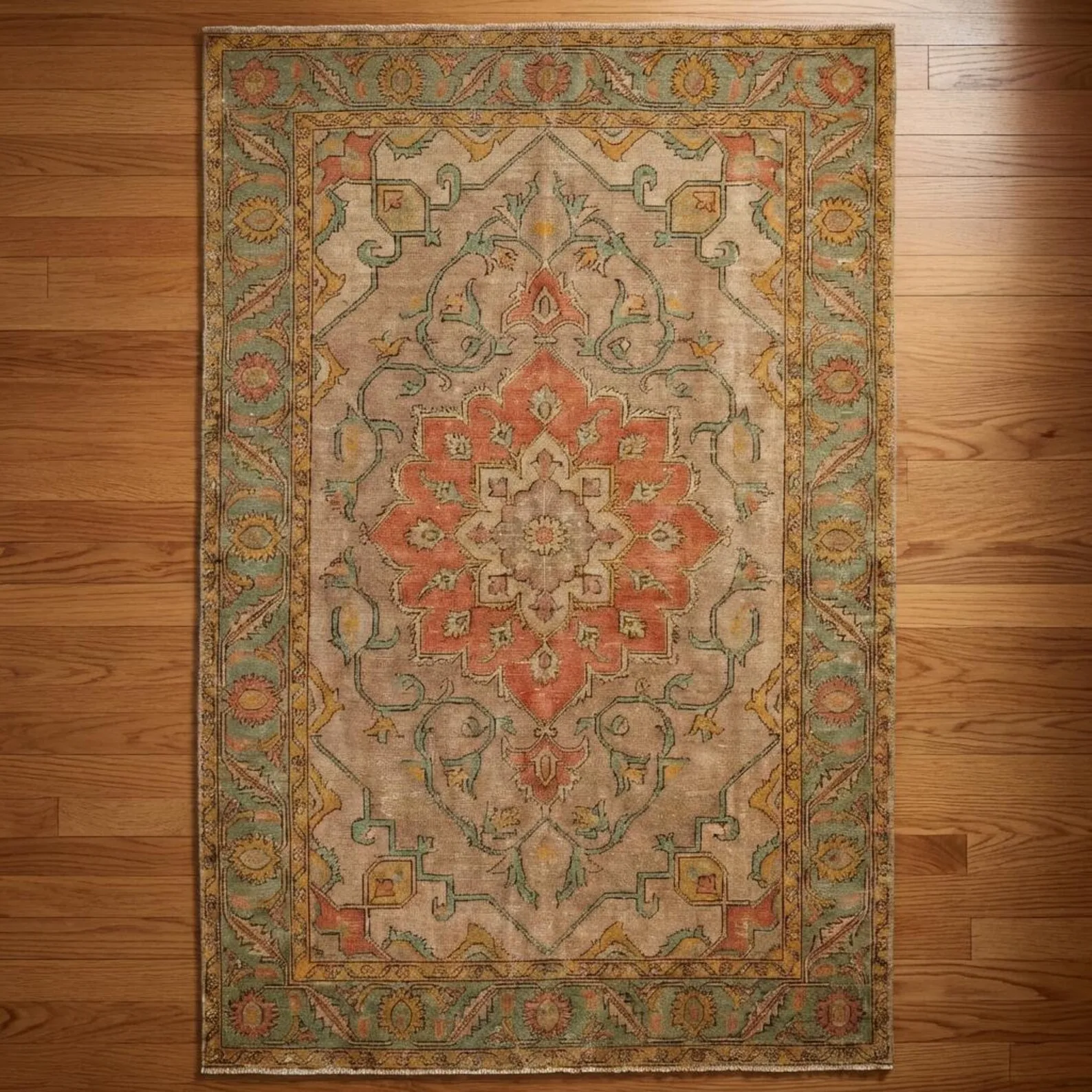 Vintage Persian hand knotted wool medallion rug Bhadohi is a masterpiece of traditional craftsmanship. This vintage Persian hand knotted wool medallion rug Bhadohi features a striking coral red central medallion on a soft beige field, beautifully framed by sage green borders with intricate floral vines and golden accents.