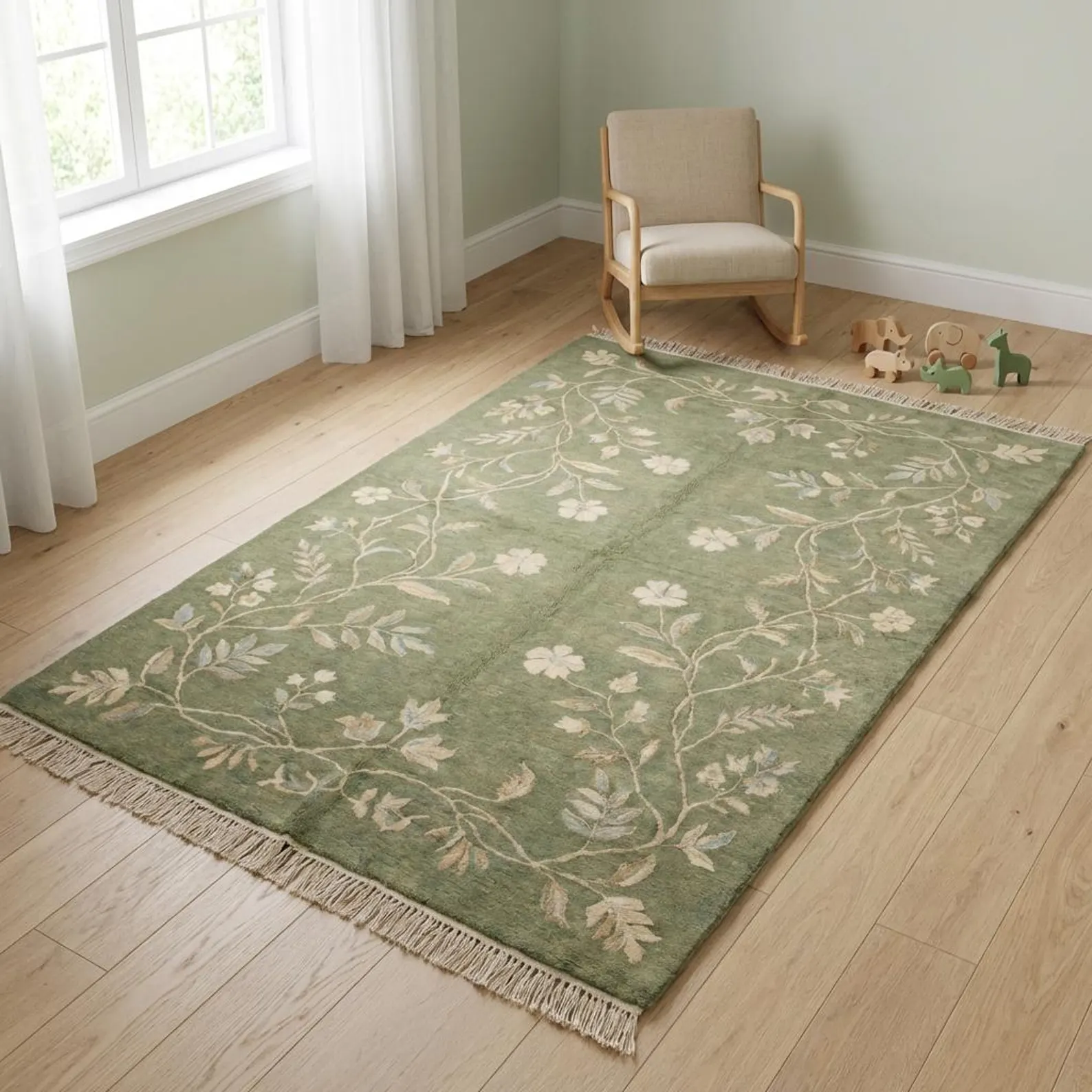 Sage green hand knotted wool rug with floral vine design handcrafted in Bhadohi India
