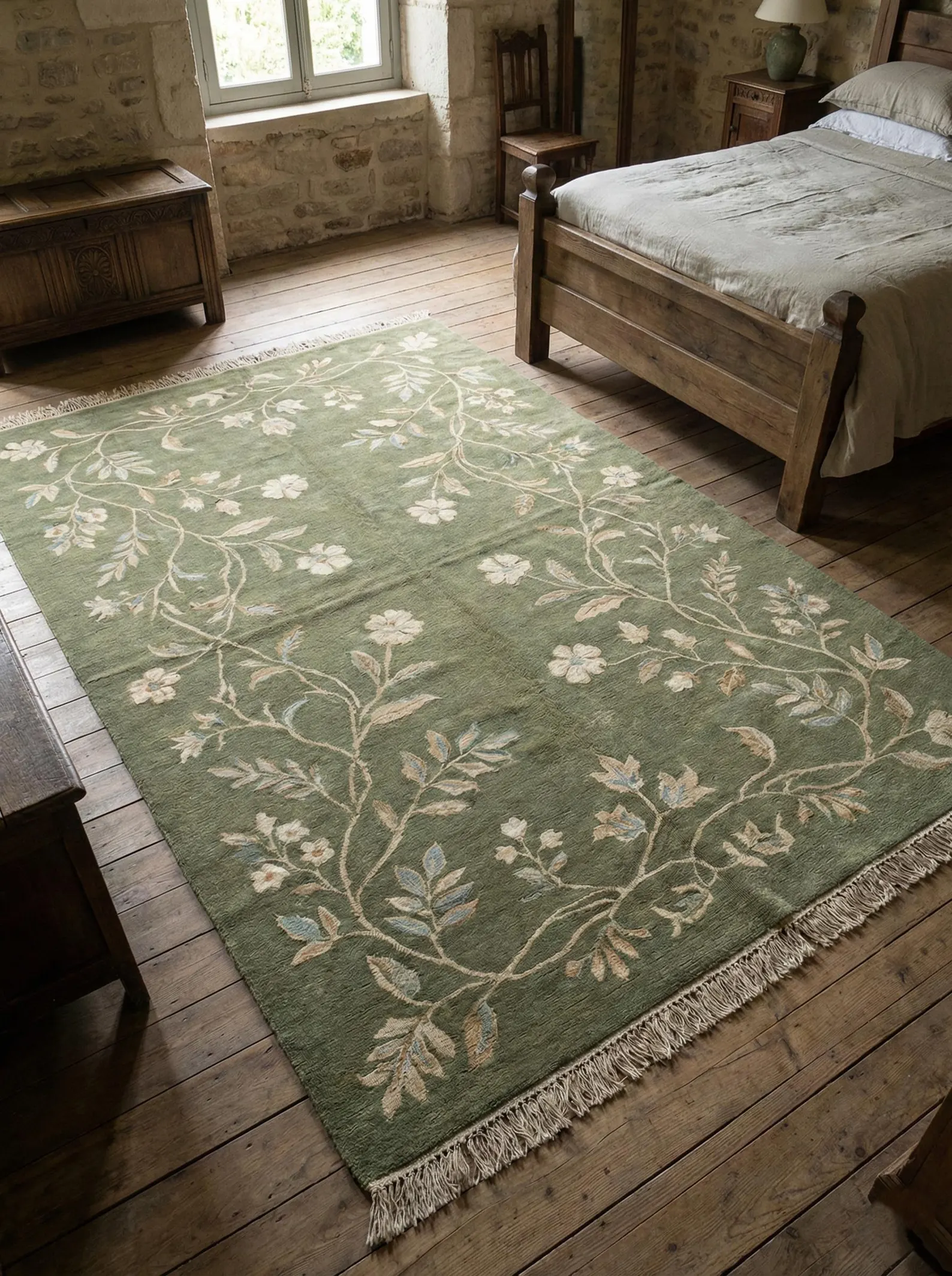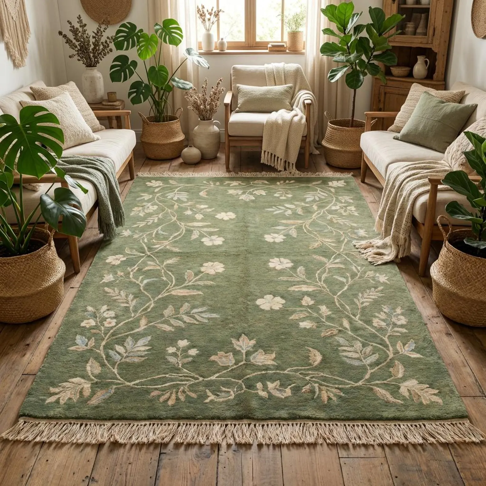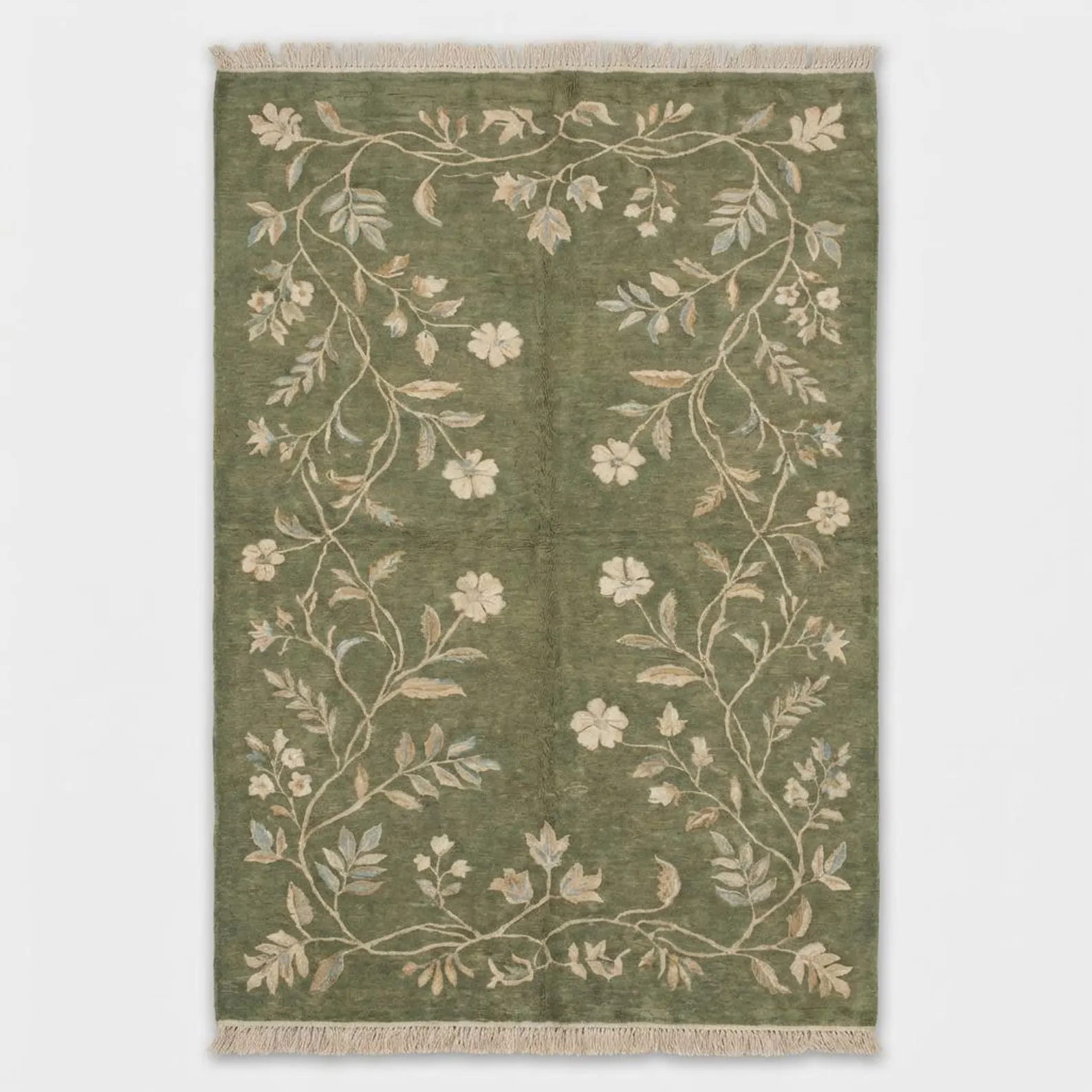 Sage Green Floral Vine Hand Knotted Wool Rug – Premium Bhadohi Indian Carpet