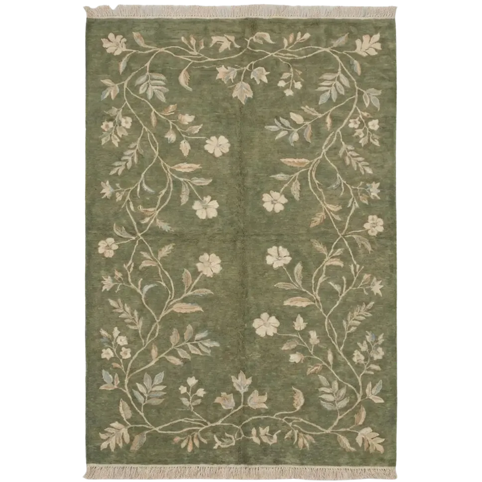 Bring timeless botanical beauty home with this sage green hand knotted wool rug. Masterfully hand-knotted in Bhadohi, India using 100% premium wool, this floral vine design features elegant cream and beige motifs on a soft sage green field. Luxuriously plush and durable – perfect for living rooms, bedrooms, or dining areas.
